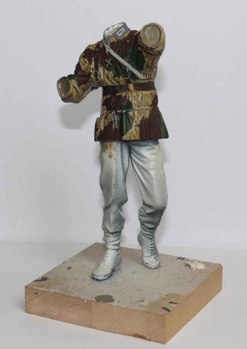 Die Bluse oder Poncho auch Tarnhemd genannt, wurde mit Khaki als Grund bemalt gedrybrusht. Die Tarnflecken habe ich mit Kreppband oder Maler Klebeband abgeklebt und die Muster rausgeschnitten mit einem Skalpell. Farben sind Vallejo. Man sieht auch die Grundierung, als Primer kann man auch eine graue Emailfarbe nehmen so wie Humbrol oder Revell. Berliner Zinnfiguren sind auch ganz okay.